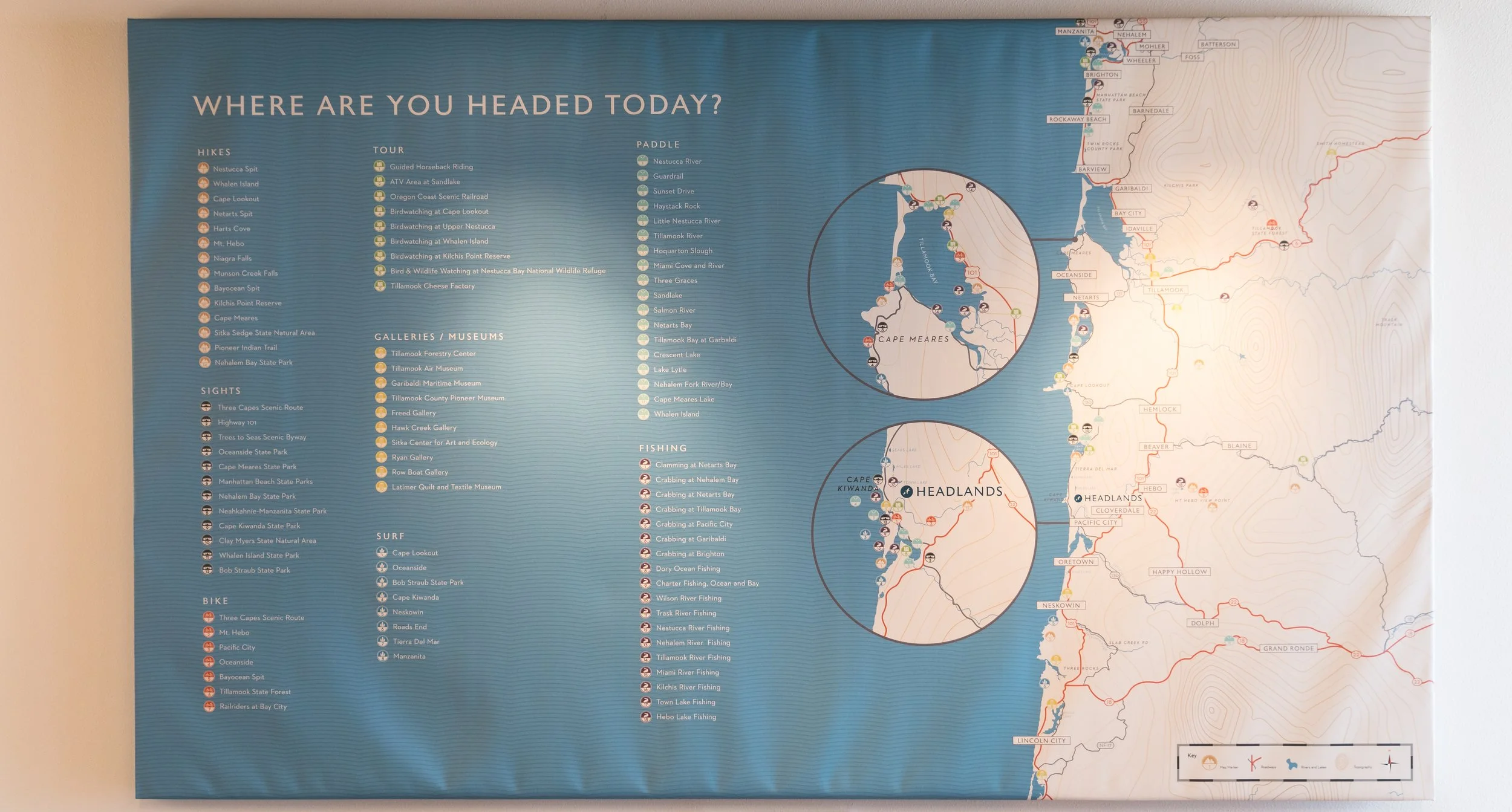 Headlands Coastal Lodge & Spa is a one-of-a-kind resort nestled in Pacific City, Oregon, with the coast as its backyard and the wilderness as its neighbor. I contributed to their evolving brand by creating a large-scale canvas map mural that highlights the range of outdoor activities available along this stretch of the Oregon Coast. To support wayfinding and guest experience, I also developed a custom icon system to categorize activities into clear groupings. These icons extended into both print and digital assets, including brochures and an online adventure planner. This work helped bring visual clarity and consistency to the Headlands experience — grounding it in place, while inviting exploration.